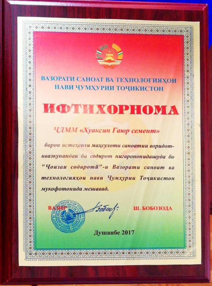 表彰會(huì)上,塔吉克斯坦工業(yè)與新技術(shù)部部長波波佐達(dá)·沙夫噶特高度評價(jià)了華新亞灣公司在塔吉克斯坦工業(yè)和經(jīng)濟(jì)建設(shè)、出口創(chuàng)匯,及履行社會(huì)責(zé)任等方面做出的巨大貢獻(xiàn),勉勵(lì)其他外資企業(yè)以華新水泥為標(biāo)桿,再接再厲,為塔吉克的發(fā)展貢獻(xiàn)更大的力量。