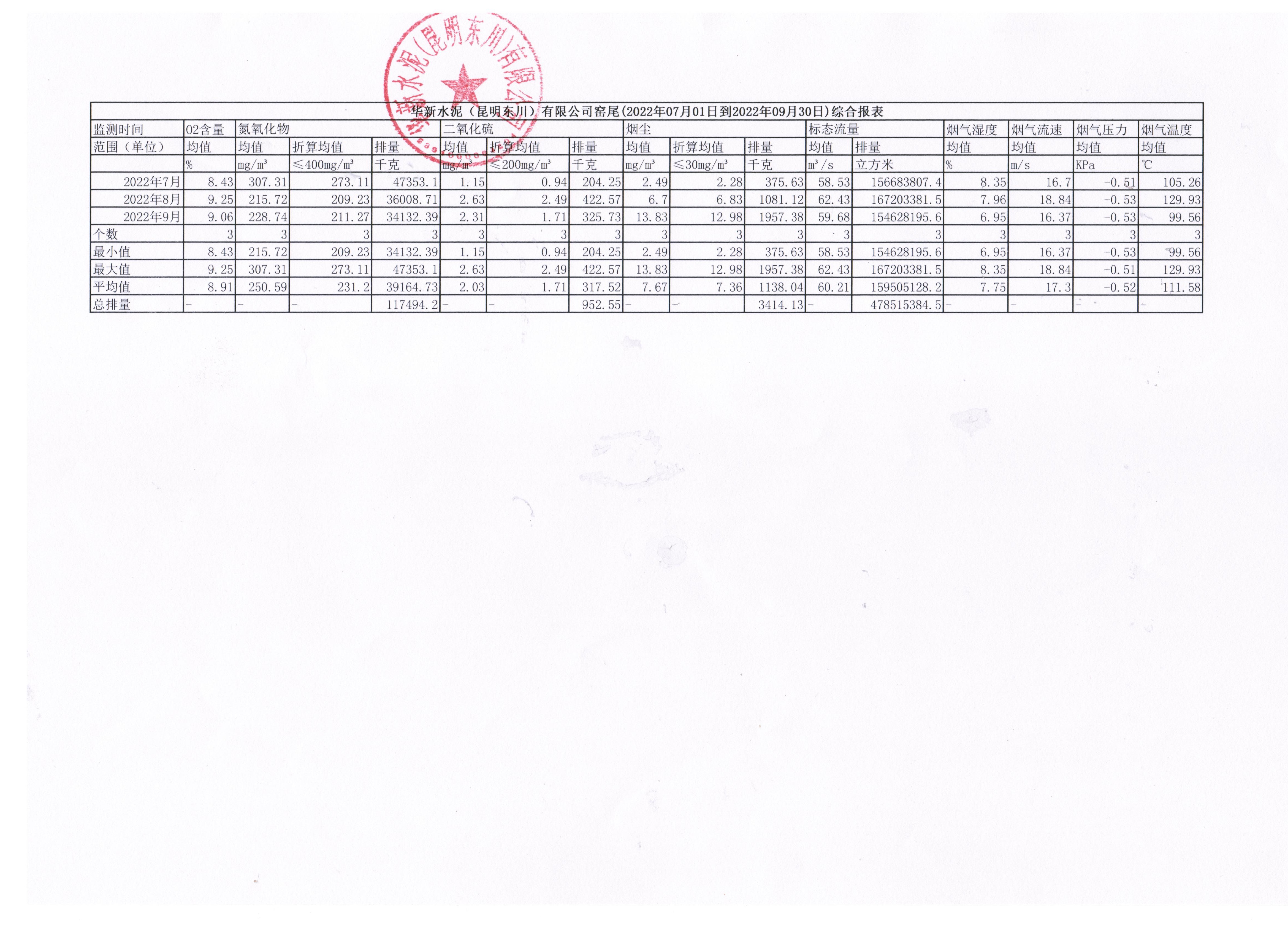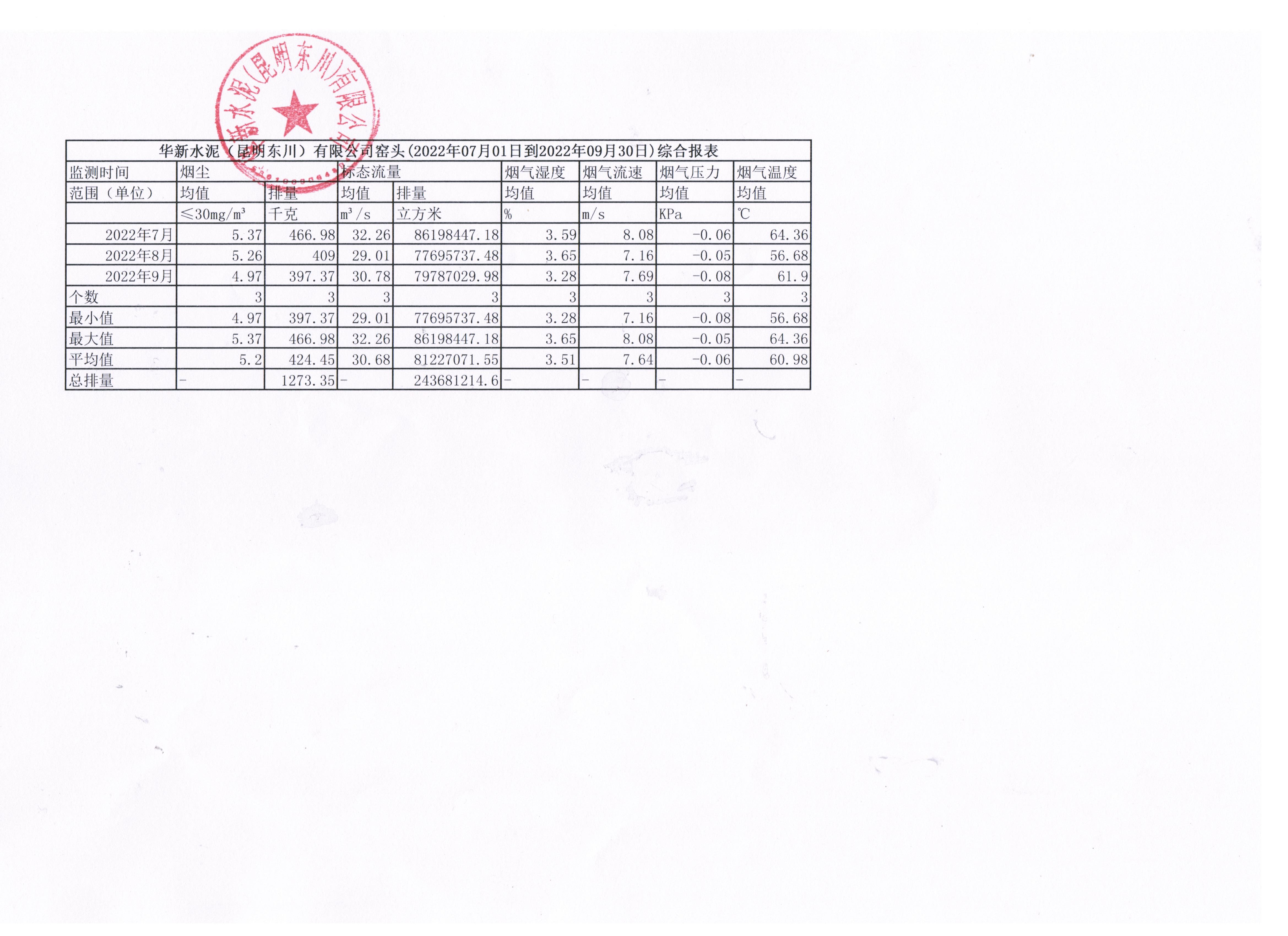 3、華新水泥(昆明東川)有限公司2022年第三季度窯頭煙氣在線監(jiān)測月平均值季報表