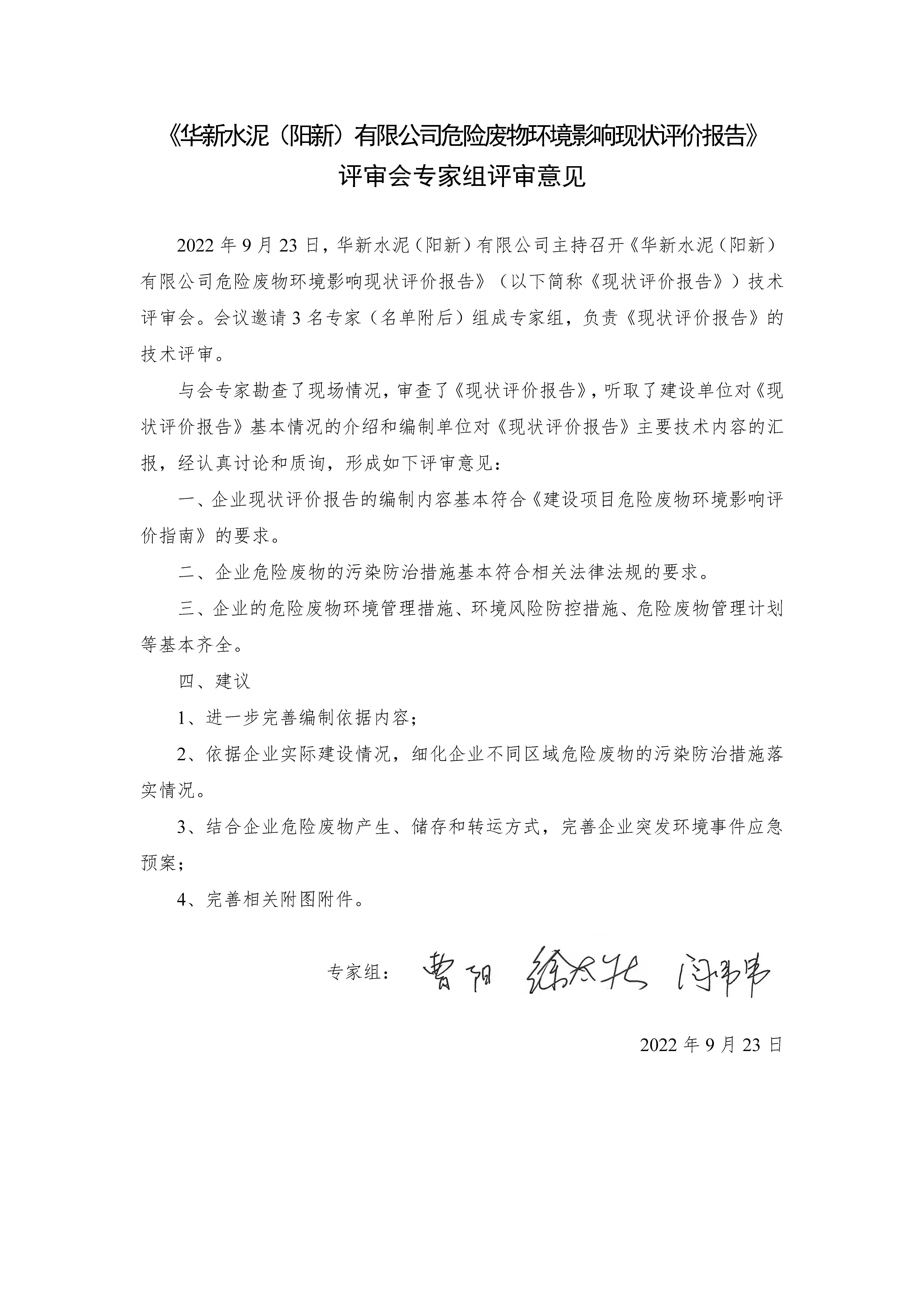 附件3:華新水泥(陽新)有限公司危險廢物環(huán)境影響現(xiàn)狀評價專家意見